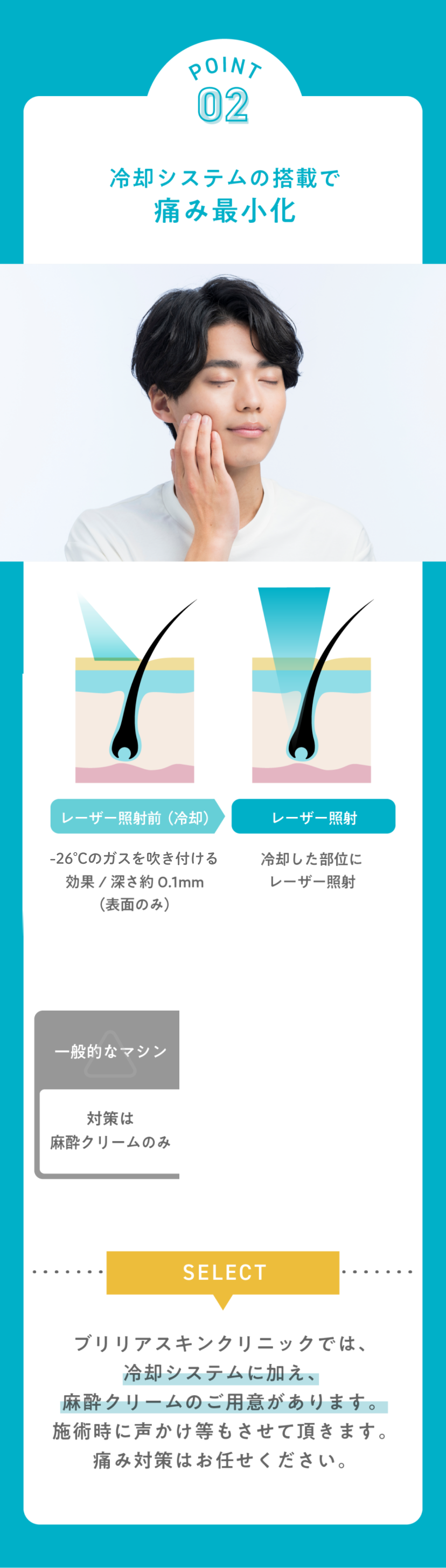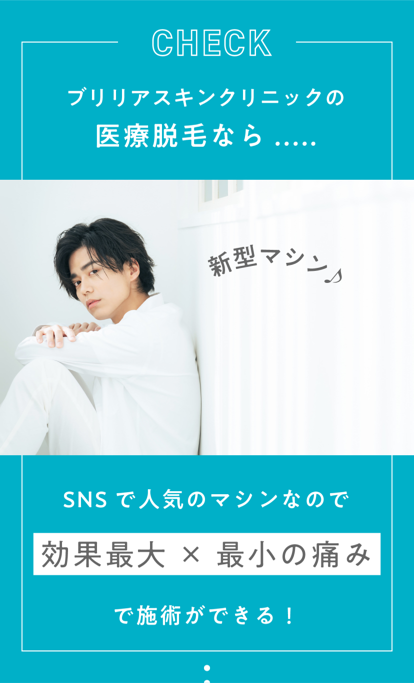 ブリリアスキンクリニックでは、患者さまには手の届く範囲で、施術前に毛を剃っていただくようにお願いしています。手の届かない範囲の剃り残しは、施術当日にスタッフが無料でシェービングいたします。ただし、剃り残しが多い場合はシェービングに時間がかかってしまい、施術時間内に照射が終わらない可能性があるため、ご自身で手の届く範囲は事前に自己処理いただくようお願いいたします。