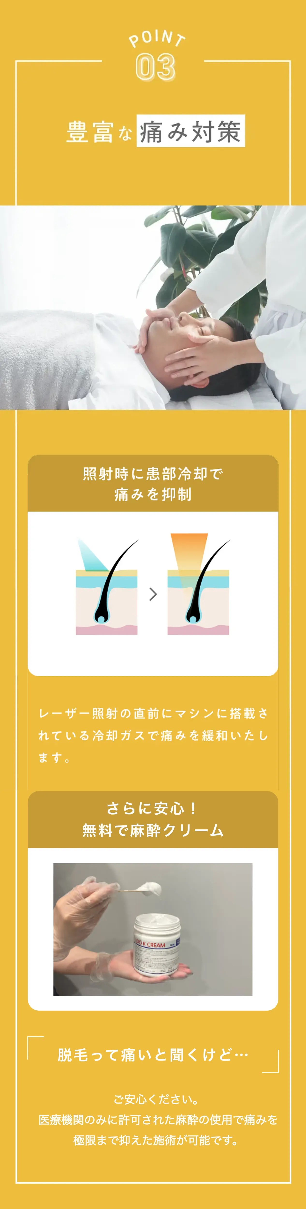 施術時の痛みが不安な方には、麻酔クリームを処方いたします。ただし、クリームに含まれる成分(リドカイン)にアレルギーがある患者さまには処方できません。また、麻酔クリームは効き始めるまでに時間がかかるため、ご利用の際は、事前のお申し出が必要となります。契約時もしくは施術予約時に医師や看護師にお伝えください。