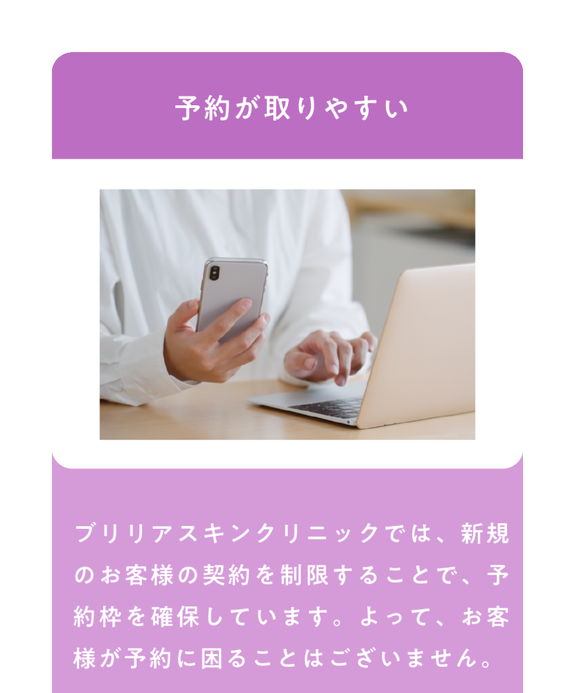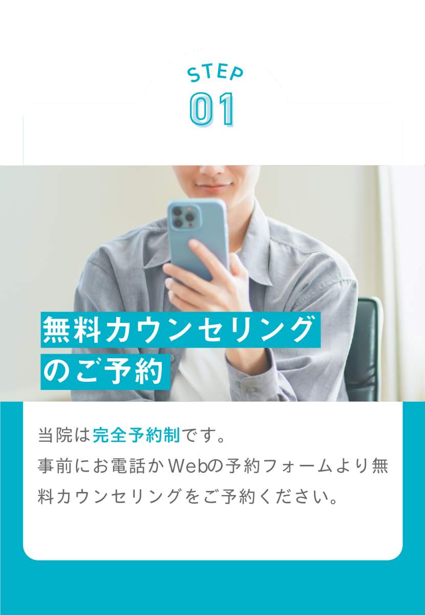 基本的には契約時に初回の施術予約をお取りいただきます。その場で日程がわからない場合は、後日お電話でご予約をお取りください。お電話が難しい場合はメールでも対応可能ですが、予約状況が刻々と変わってしまうためお電話でのご予約をおすすめします。
